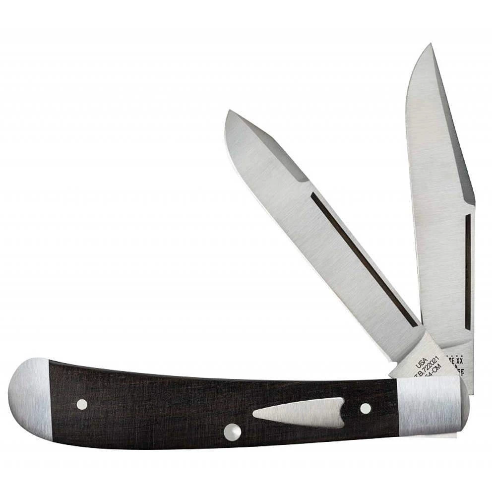 Handcrafted in the U.S.A., this classic American Case HT Trapper is about 4 inches long (folded/closed) and weighs approximately 3.6 ounces. The handle is Smooth Ebony Wood with an Arrowhead Stainless Steel Inlay shield. The bolsters are Stainless Steel. This knife utilizes a 3 1/4″ Clip blade and 3 1/4″ Spey blade. Stamped with pattern number TB722021 154-CM, the blade material is 154-CM Stainless Steel with Satin finish.Â