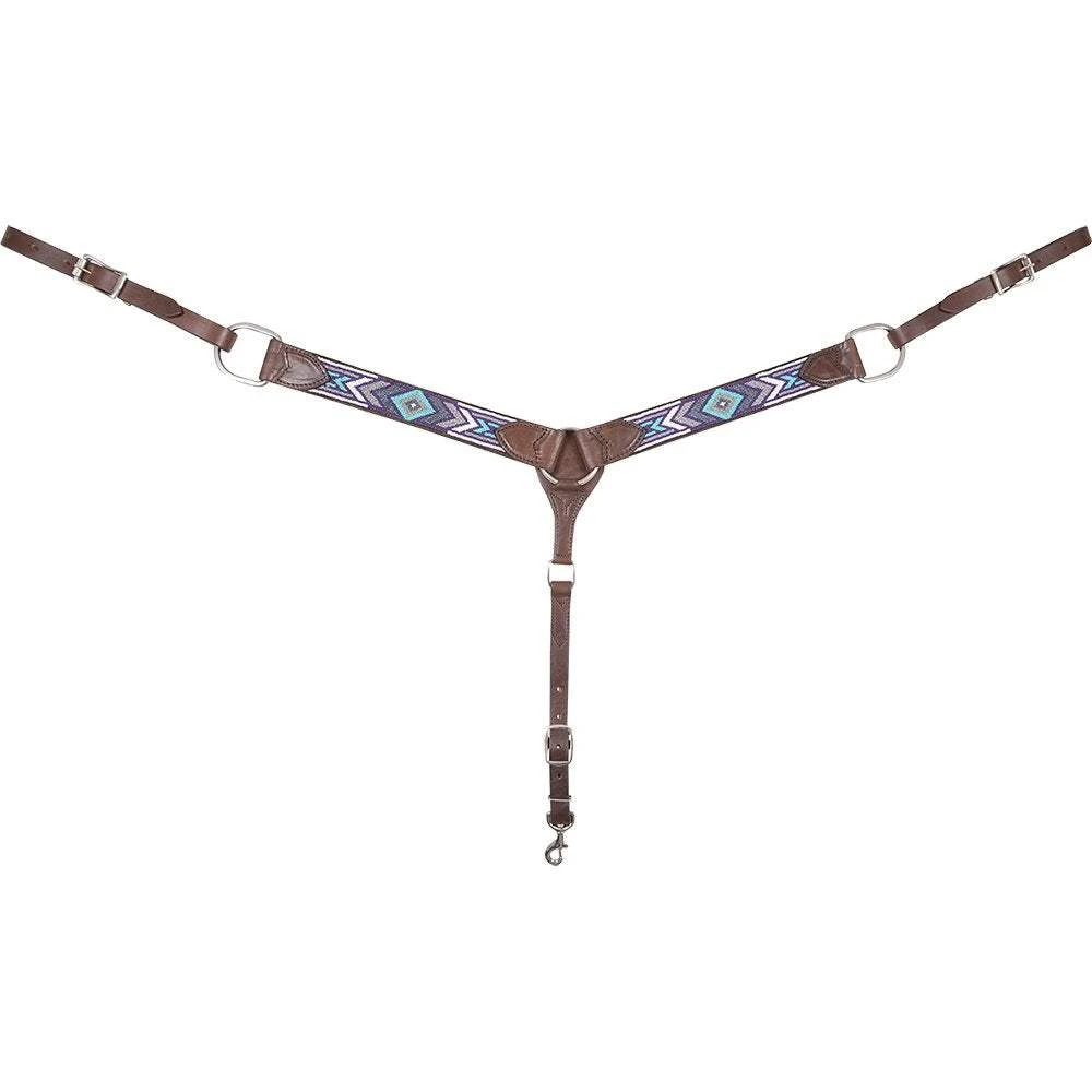 The Cashel Angel Fire breast collar is made of chocolate skirting leather with blue/purple beaded accents and 2″ wide.