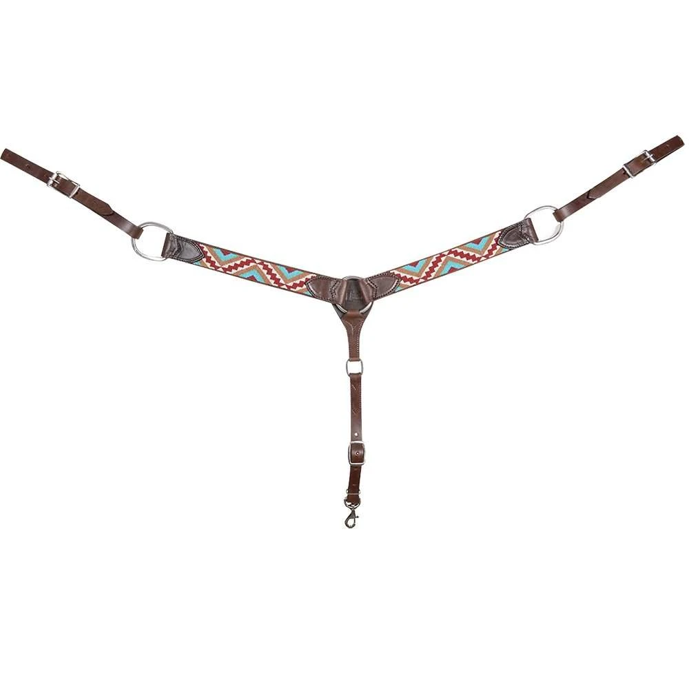 The Cashel Chocolate/Tan breast collar is made of chocolate skirting leather with beaded accents and 2″ wide.