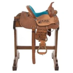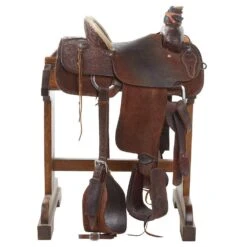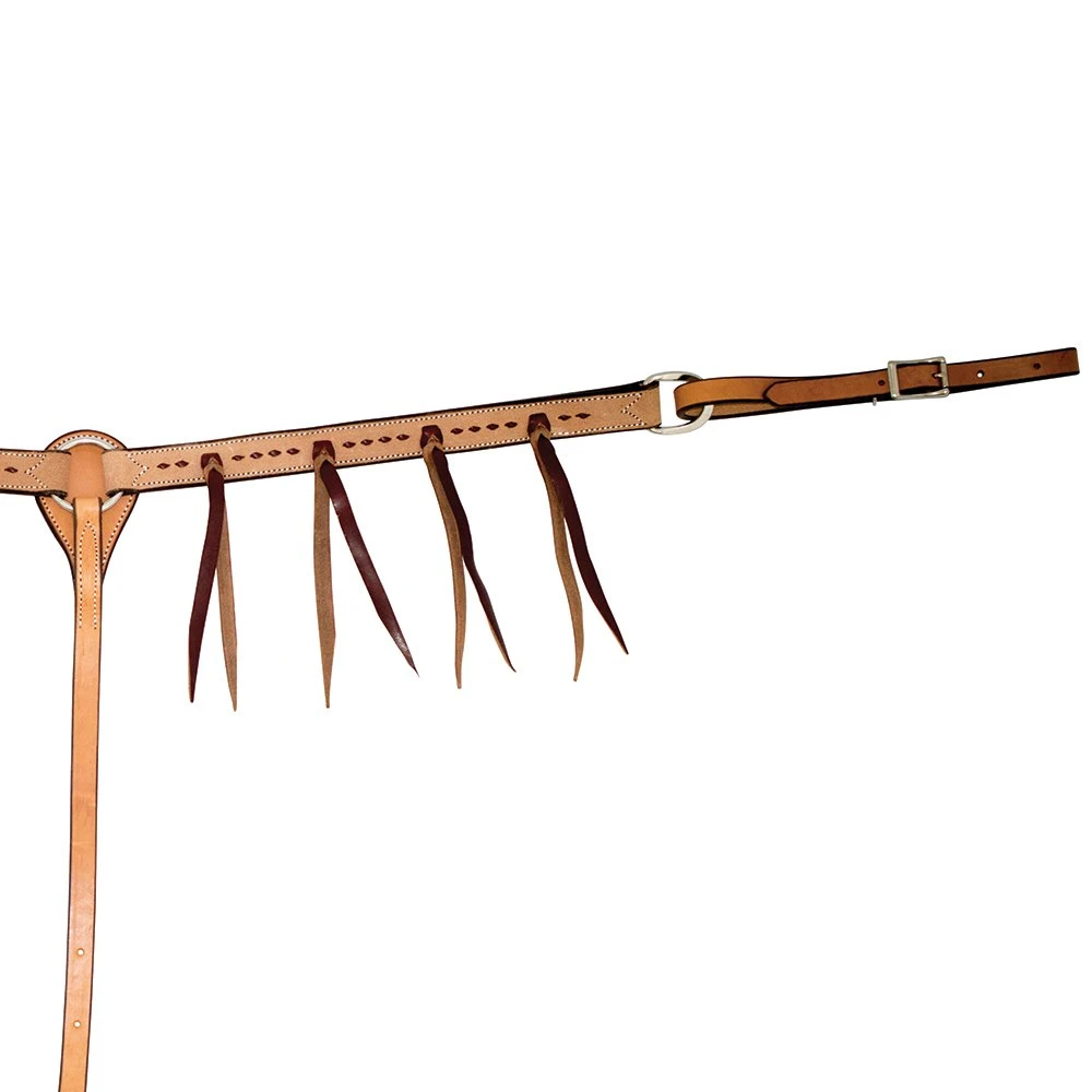 Golden roughout saddle leather breast collar with buckstitch and Latigo Cowboy strings. Includes tug straps and roller buckles.