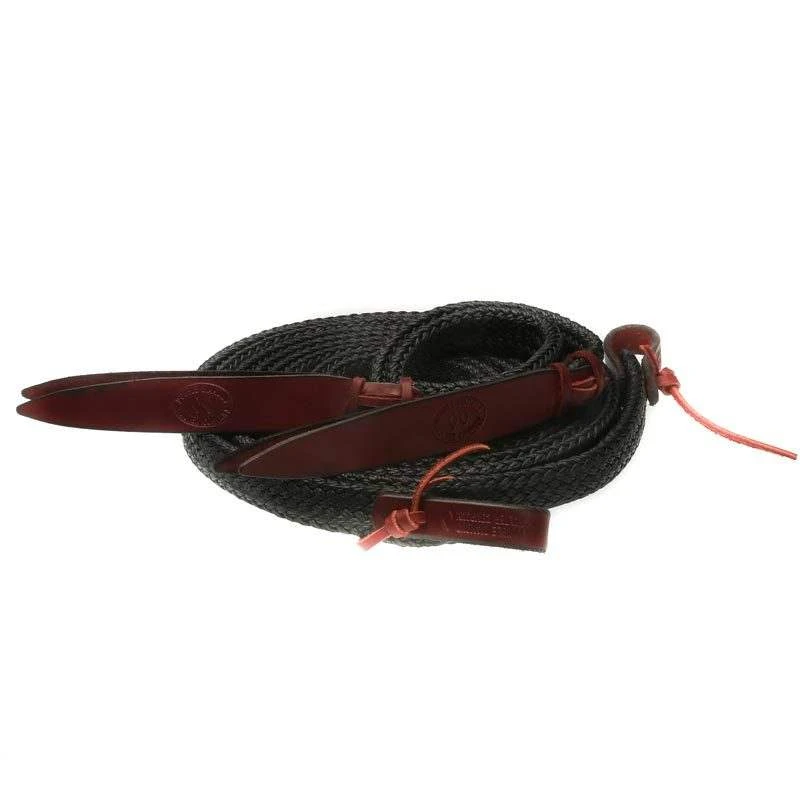 Made from lightly waxed rolled braid nylon rope. They are weighted for proper balance and the length works great for snaffle bits. They connect to the bit with 3/4″ wide 10/11 oz. burgandy harness leather water straps and have doubled tear drop shaped 6/7 oz. leather popper on the other end of the rein for weight.
