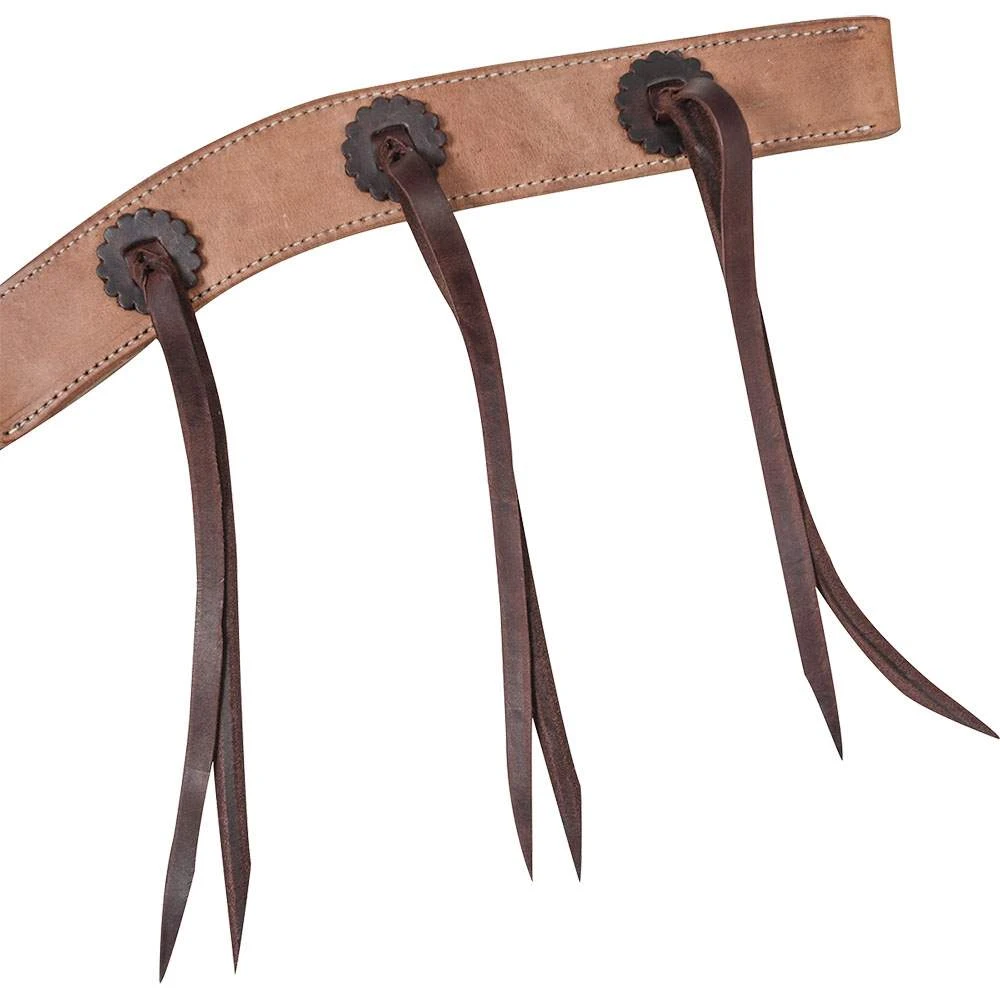 This Martin Saddlery breast collar is made of 2 inch quality harness leather and features latigo leather rosettes and strings. Stainless steel hardware.