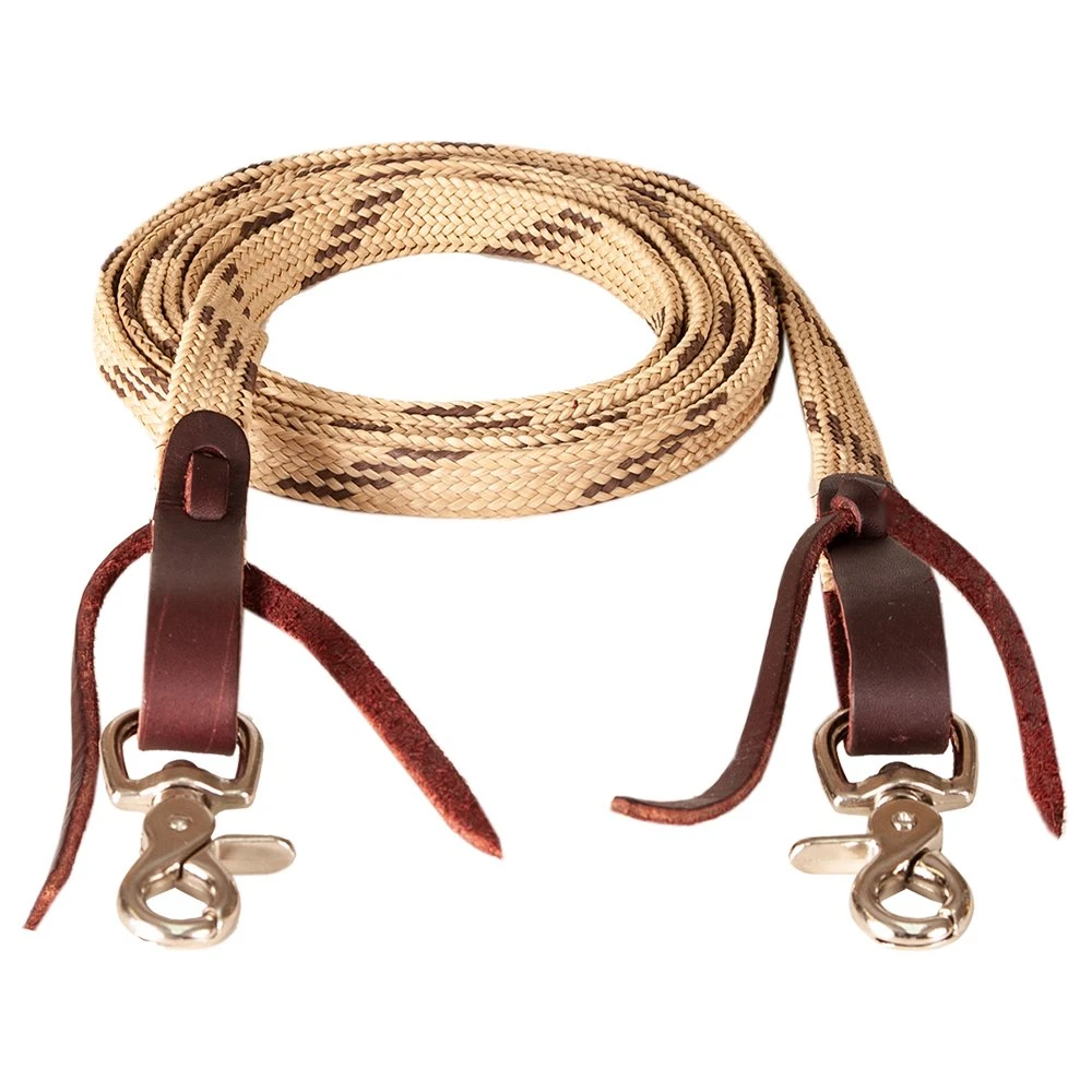 5/8″x8′ flat waxed roping rein with latigo waterloop ends and nickel plated scissor snaps.