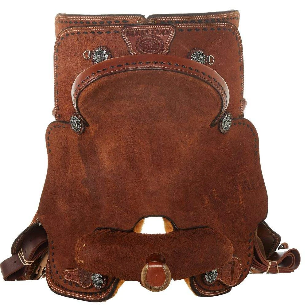 This NRS Competitor Series Team Roper has a 5 year warranty on the rawhide covered wood tree, silver floral berry conchos, roughout leather covered roper stirrups, all roughout chestnut leather, front 7/8 drop rigging, a hard seat, and 90/10 wool blend lining. The seat pocket is constructed to help hold the roper in place and offer better balance effectively giving the roper every advantage.