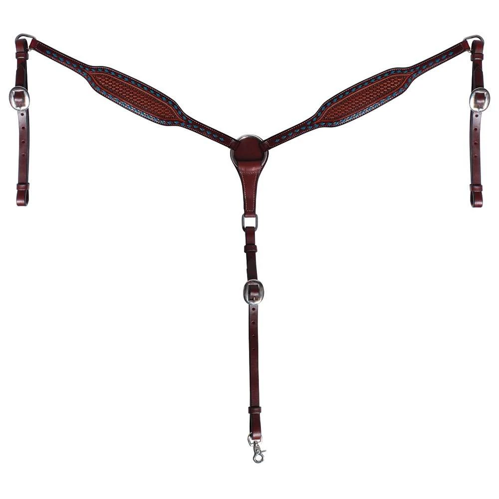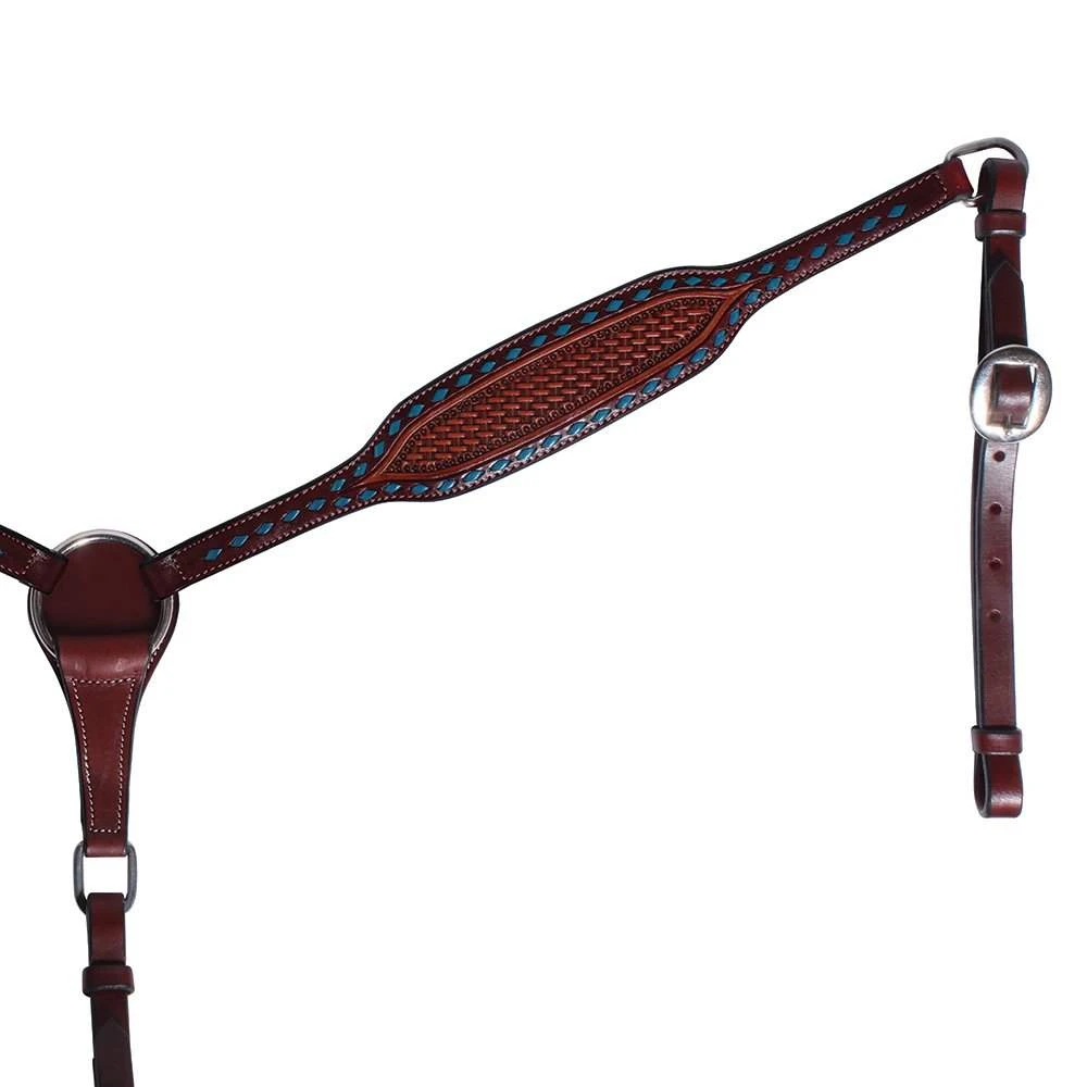 Basketweave breast collar accented with turquoise blue buckstitching, stainless steel hardware.
