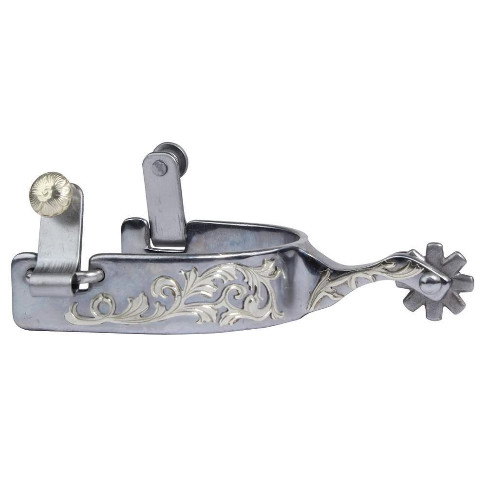 This spur has a decorative floral design on the 1″ band and an 8 point rowel.