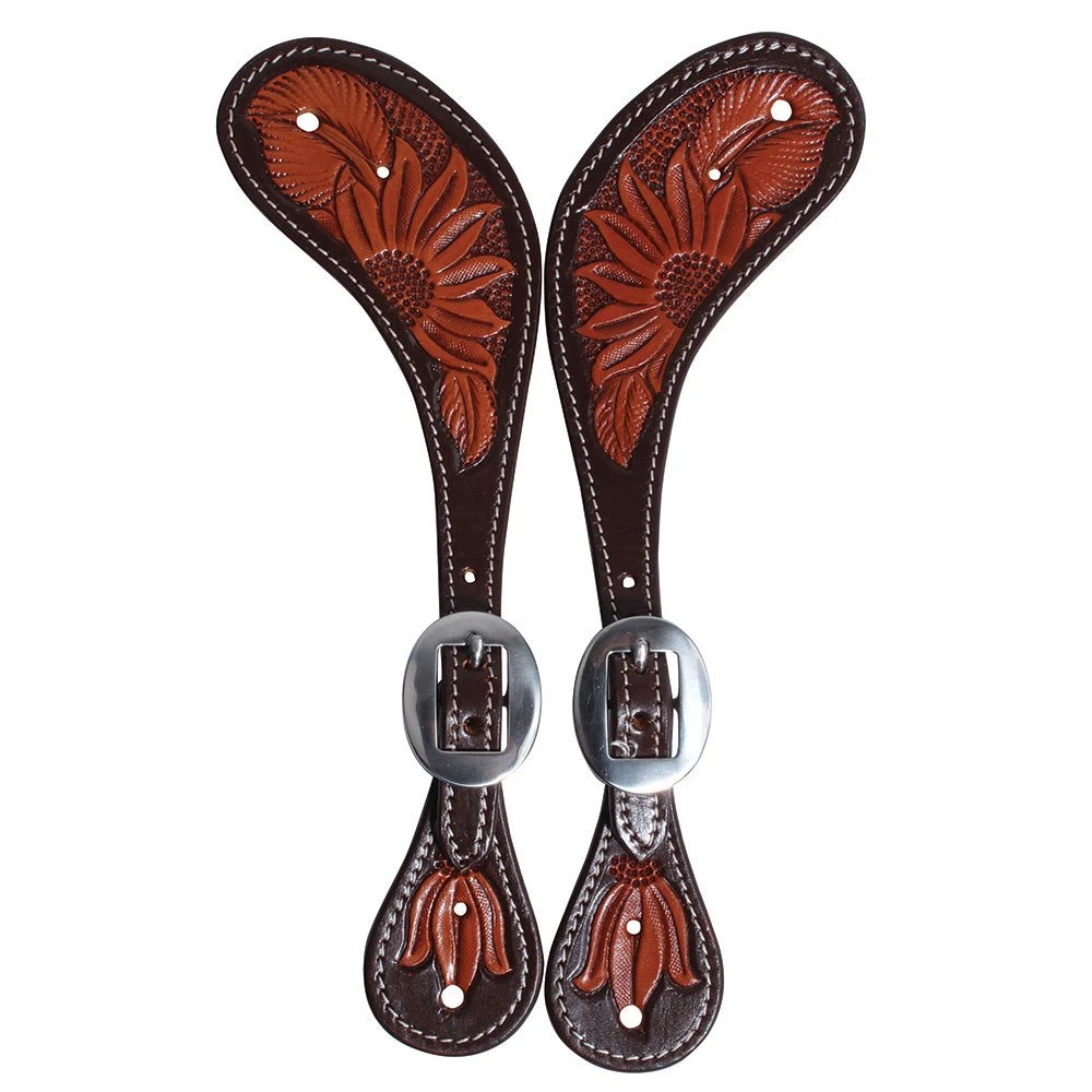 Pictures cannot do justice to the exclusive Professional’s Choice designed sunflower tooled pattern on this collection. Rich chocolate colored leather and natural tooling will be a standout on any horse. Stainless steel buckles. Sold in pairs