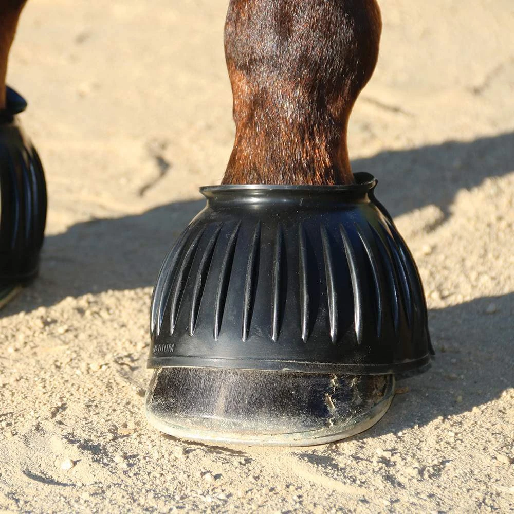 These Professional’s Choice ribbed rubber bell boots are flexible and durable for extended use. Constructed from high quality rubber, these boots stretch for easy application yet are resilient and will not attract burs, stickers, or grass. The collar is rolled for maximum comfort. Provides 360 degree protection and protects the horse from overreaching. The pull-on design will stay on during exercise, turn-out, also can be used in the trailer or stall. Sold in pairs.