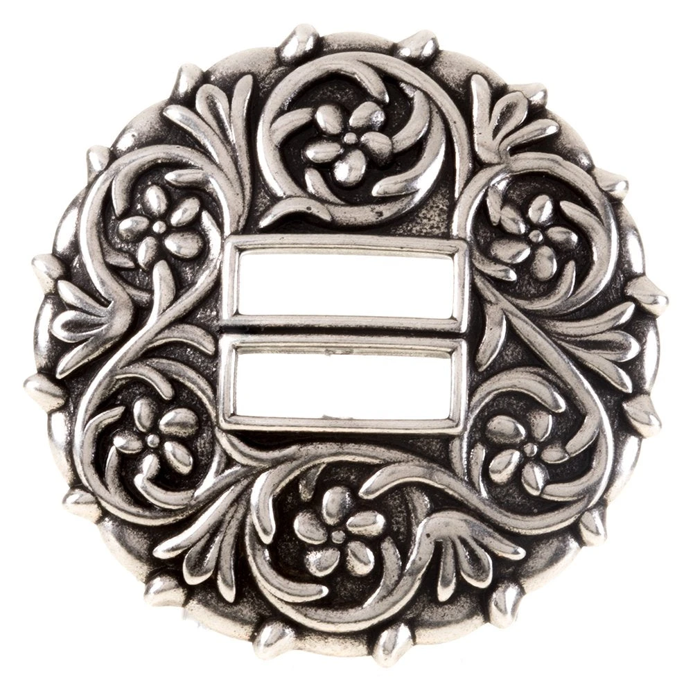 This slotted concho measures at 1 1/2in long. Floral Vine Scalloped detail all over the concho. Great for headstalls, saddles, and leggings!
