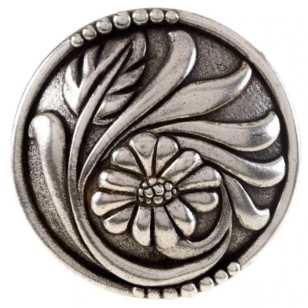 This Rino Inc concho features a single flower design with beaded accents on the border. Add this slide to any wild rag or scarf for a classy look.