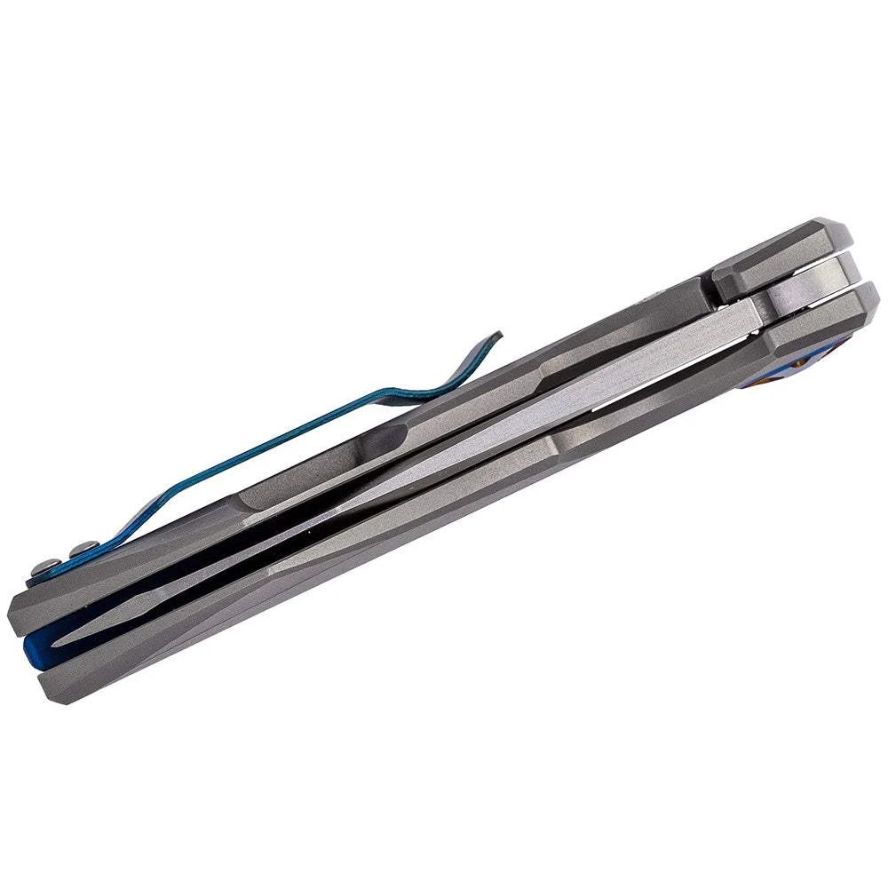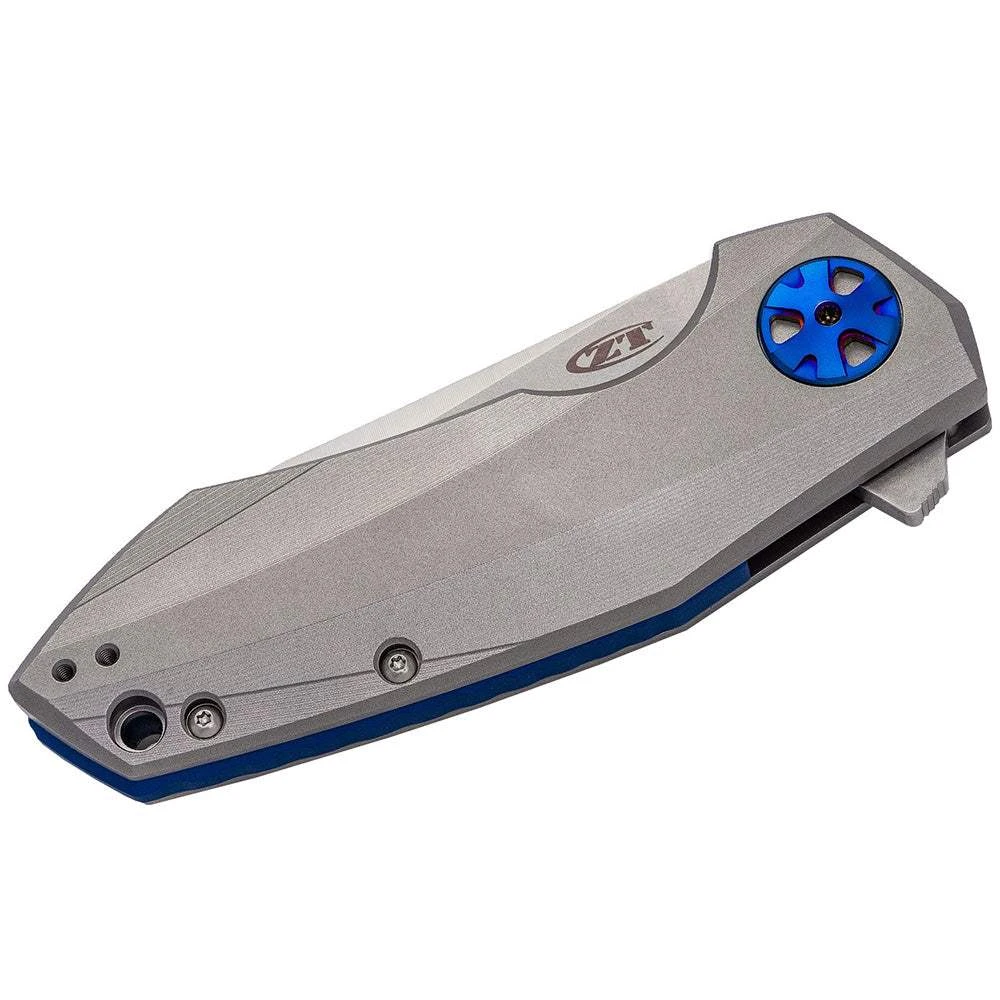 Custom knife-maker Dmitry Sinkevich teamed up with Zero Tolerance to produce this stunning 0456 Titanium Flipper knife. This knife features 3-D rayed handle contours and a custom blade shape. The high quality blade is made from CPM-20CV steel, and comes in a sheepsfoot style with a two-tone finish. ZT’s KVT Ball Bearing system provide smooth opening and a titanium frame lock firmly secures the blade in the open position. Custom touches include a blue anodized pivot, backspacer and reversible pocket clip. Model: 0456